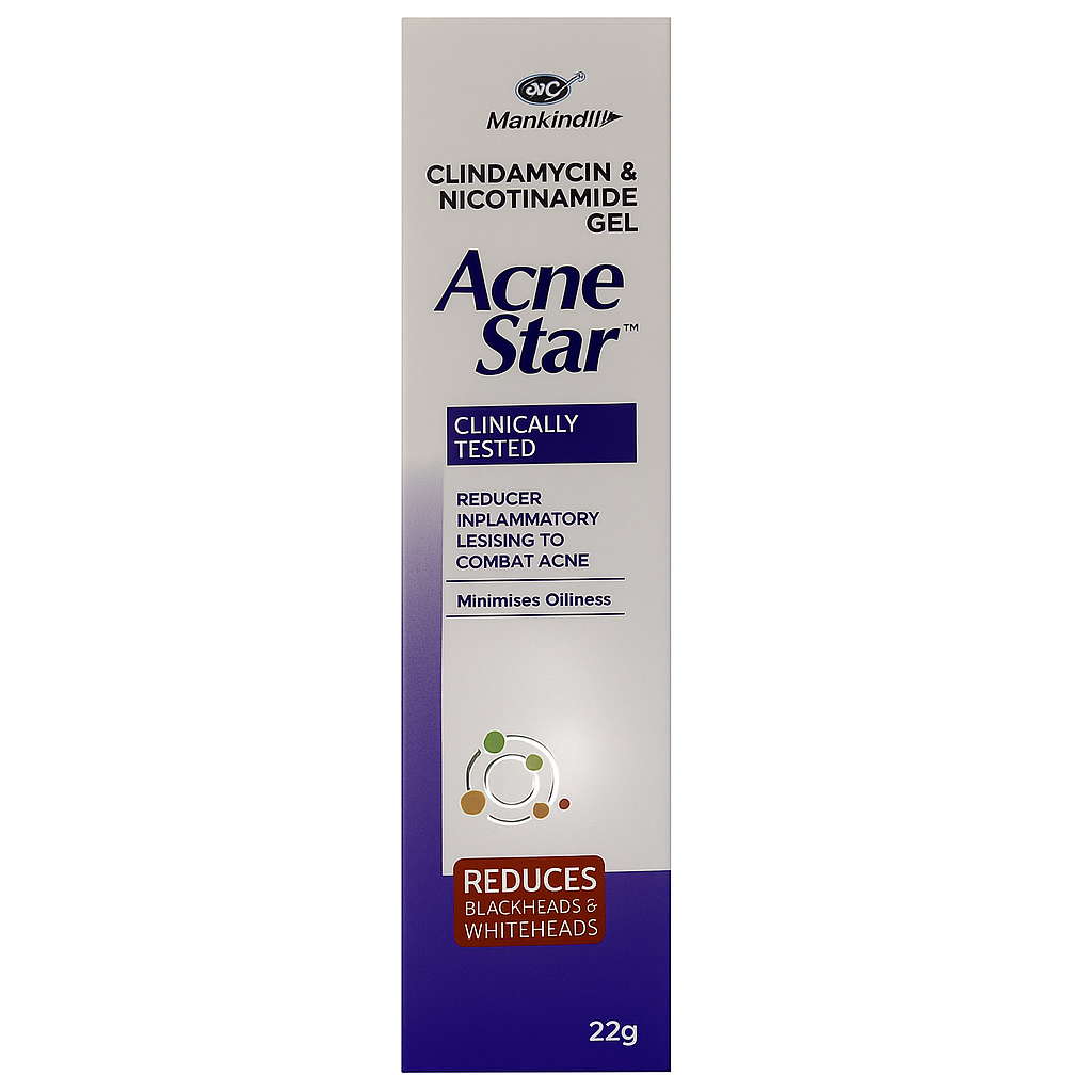 AcneStar Gel 22g is a powerful anti-acne treatment formulated with Clindamycin and Nicotinamide to effectively fight acne-causing bacteria, reduce inflammation, and prevent future breakouts. It penetrates deep into the skin, unclogs pores, and helps fade acne marks for clearer, healthier-looking skin.