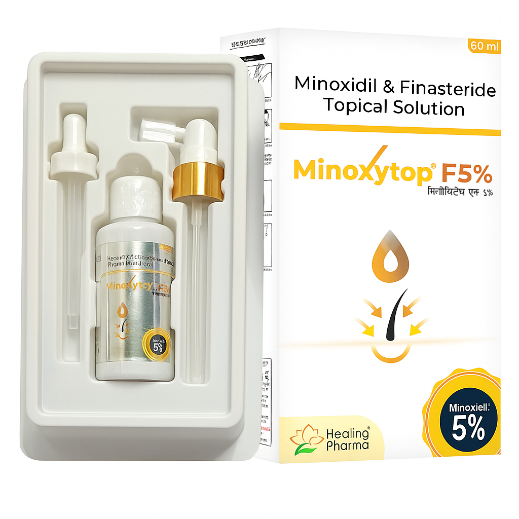 Minoxidil + Finasteride Solution 5% is a topical hair loss treatment that combines two clinically proven ingredients to combat androgenetic alopecia (male pattern baldness). Minoxidil stimulates blood flow to hair follicles, promoting hair growth, while Finasteride inhibits the conversion of testosterone to dihydrotestosterone (DHT), the hormone responsible for hair follicle shrinkage. This dual-action formula is applied directly to the scalp, typically once or twice daily. It may show results within 3 to 6 months of consistent use. Common side effects can include scalp irritation or itching. Topical application may reduce the risk of systemic side effects compared to oral Finasteride, but medical guidance is recommended.