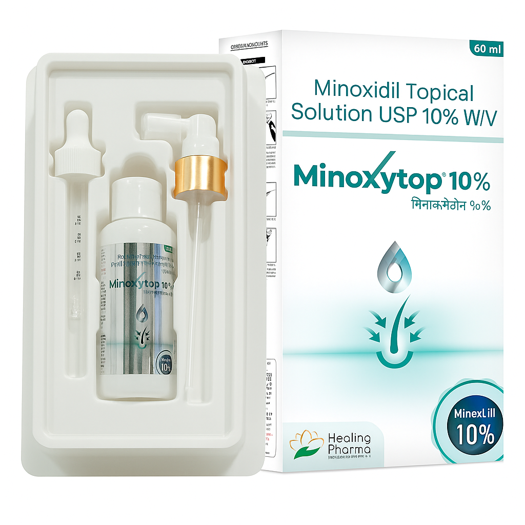 Minoxidil 10% topical solution is a high-strength formulation used to treat advanced or stubborn cases of androgenetic alopecia (male pattern baldness). It works by stimulating hair follicles, increasing blood circulation to the scalp, and extending the hair growth phase. This higher concentration is typically used when lower strengths (like 5%) are less effective. It is applied directly to the scalp, usually twice daily. Results may begin to appear in 2ā4 months, but continued use is required to maintain hair growth. Potential side effects include scalp irritation, dryness, and increased shedding in the early stages. Use under medical supervision is recommended.